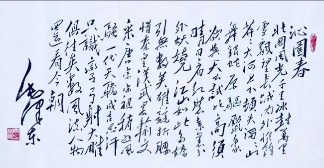 - 创作实践成果丰硕:他的书画作品多次在全国政协、全国新闻出版界、中直机关及中央电视书画频道等举办的高规格活动中展出并获奖,具有广泛的影响力。其仿毛泽东书法作品尤为出彩,《长征》《满江红》《沁园春》等经典诗词的书法创作,不仅精准还原了毛体书法的雄健气势与独特韵味,更融入了个人对诗词内涵的深刻理解,其中《沁园春·雪》还在2013年中央电视台书画频道迎春活动中展播,让更多人领略到毛体书法的魅力。